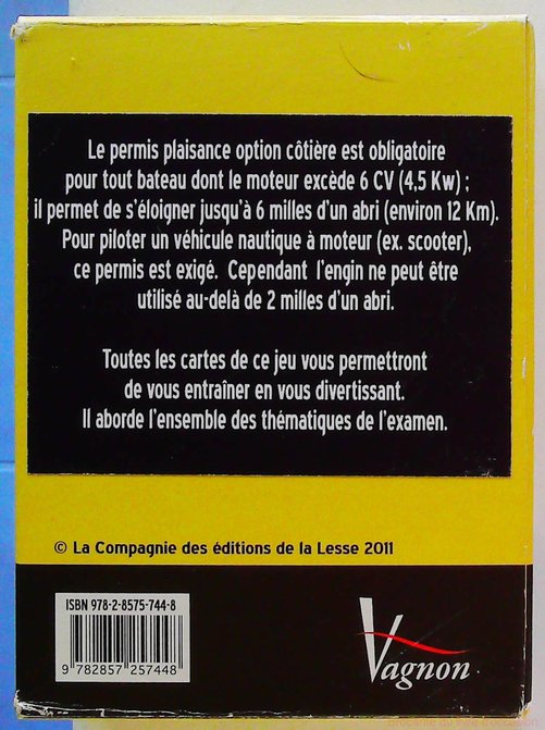 Le jeu est publié par La Compagnie des éditions de la Lesse. La date de publication remonte à l’année 2011. Le logo de l’éditeur Vagnon apparaît sur la couverture. Cet éditeur est spécialisé dans les manuels nautiques. La charte graphique utilise un fond noir et du jaune vif. Ce contraste assure une excellente lisibilité des informations.