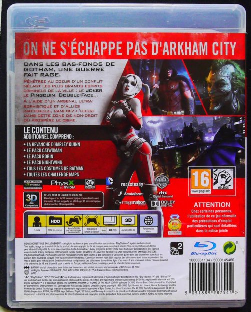 Couverture arrière du jeu vidéo Batman: Arkham City (version Blu-ray pour PlayStation 3) :