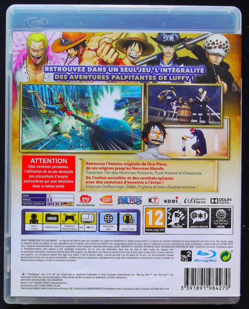 Préparez-vous à une aventure épique avec One Piece Pirate Warriors 3, un jeu vidéo de Bandai Namco Entertainment sorti le 28 août 2015. Ce titre vous permet de revivre l’histoire de Luffy et de son équipage, du début de leur périple jusqu’à l’arc de Dressrosa. Vous affronterez des hordes d’ennemis et des boss redoutables avec les membres de l’équipage du Chapeau de Paille. Grâce à une action frénétique et un scénario fidèle, ce jeu est une célébration de l’univers de One Piece, une plongée dans l’un des plus grands succès du manga. Indispensable pour tous les fans.