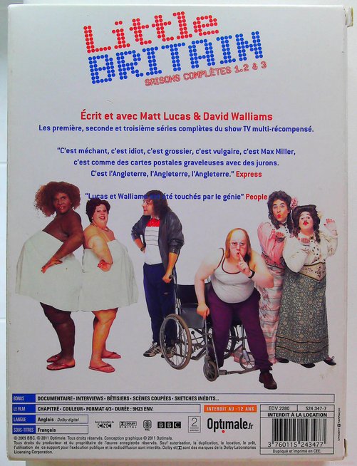 Le coffret porte la mention “Interdit aux -12 ans”. Cette restriction est due au langage et au contenu satirique. La série s’adresse clairement à un public averti. Elle plaît aux amateurs d’humour noir et de caricature sociale. Son ancrage culturel britannique est très prononcé. Little Britain reste une référence incontournable de la comédie.