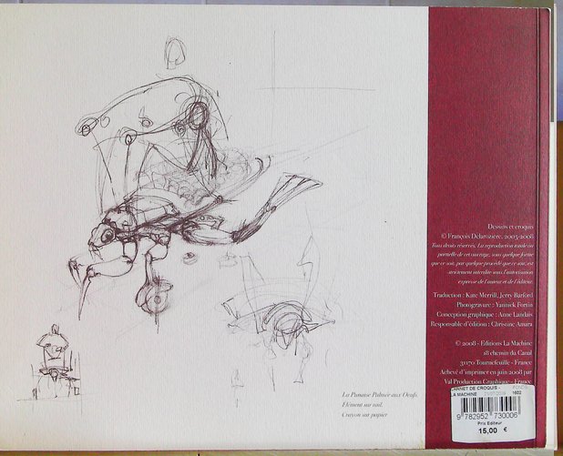 Bien que le nom de l’auteur ne soit pas explicitement donné sur cette page, les références à François Delarozière (cité dans les crédits : « © François Delarozière, 2005/2008 ») et au style caractéristique (machines animées, créatures hybridées) permettent d’identifier l’artiste comme le célèbre créateur de théâtre d’objets et d’installations mécaniques. L’ouvrage semble être un recueil de ses dessins préparatoires ou autonomes, témoignant de son processus créatif — où l’humain, la machine et l’animal se fondent dans une poétique singulière, à la fois burlesque, philosophique et technique.