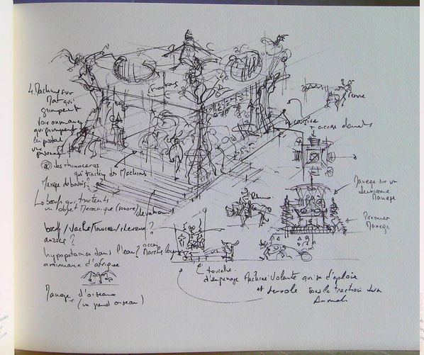 L’ouvrage regroupe des croquis préparatoires et autonomes. Ces dessins au crayon sont dynamiques et expressifs. Ils captent l’énergie et le mouvement des futures machines. Le style est à la fois grotesque, surréaliste et technique. On y perçoit l’humour et la poétique de Delarozière. Ce carnet est un témoignage unique de sa méthode de travail.