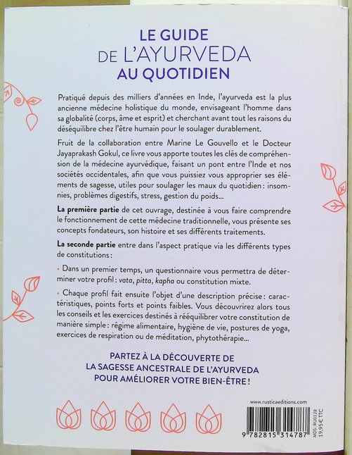 Ce livre offre une introduction complète et accessible à l’Ayurveda, médecine traditionnelle indienne millénaire. Il présente les concepts clés comme les trois doshas (Vata, Pitta, Kapha), les cinq éléments et l’importance de l’équilibre personnel pour une santé globale. Il sert de guide essentiel pour qui souhaite comprendre les bases de cette philosophie de vie.