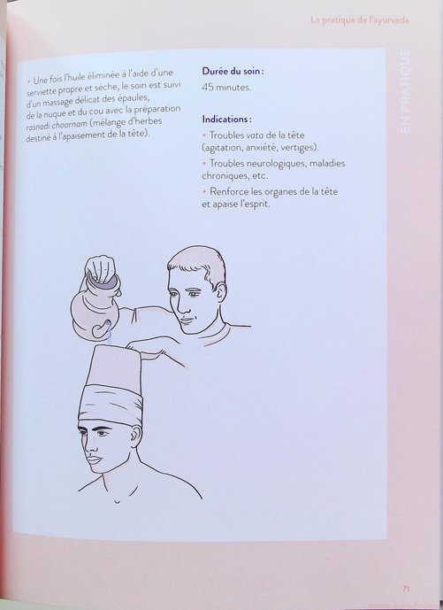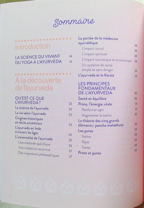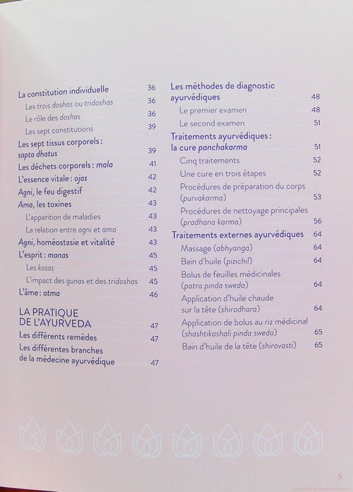 Une partie importante est dédiée à la nutrition ayurvédique, expliquant comment choisir et préparer les aliments selon sa nature. Le guide aborde aussi les routines de soin corporel (dinacharya), la gestion du stress et des recommandations pour une détoxification de l’organisme, favorisant une vitalité durable.