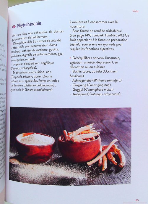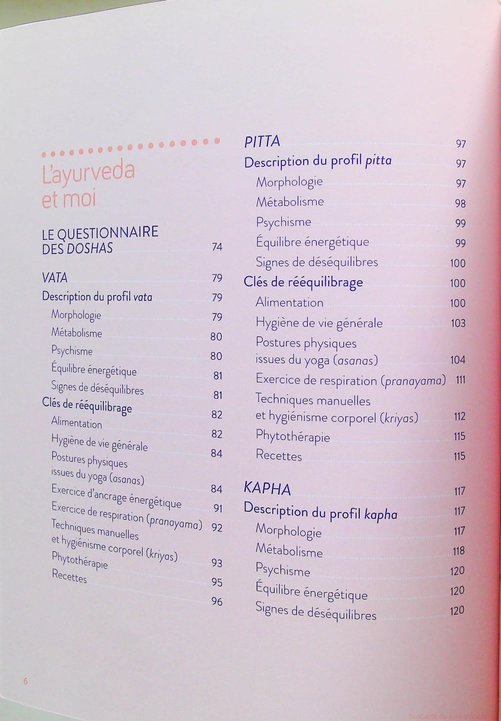 Le livre détaille ensuite chaque profil de Dosha. Le questionnaire aide à identifier sa constitution dominante. Pour Vata, des clés concernant l’alimentation sont données. L’hygiène de vie générale et les postures de yoga adaptées suivent. Des exercices de respiration (Pranayama) sont proposés. Les techniques manuelles (Kriyas) et la phytothérapie sont expliquées. Des recettes culinaires équilibrantes complètent le chapitre. Les profils Pitta et Kapha reçoivent le même traitement détaillé.