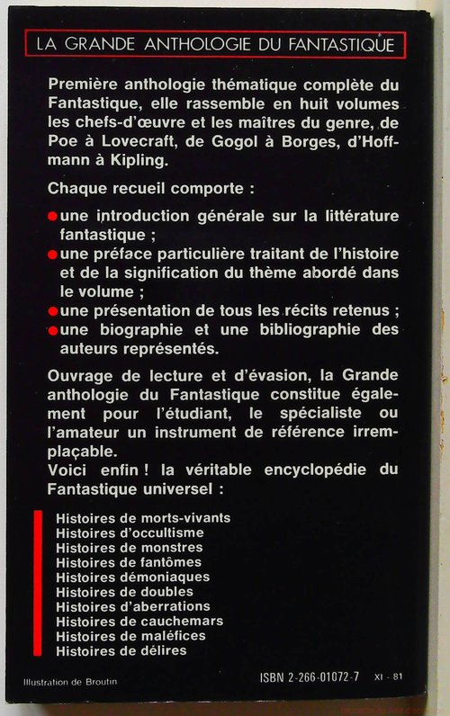 Première anthologie thématique complète du Fantastique, elle rassemble en huit volumes les chefs-d’œuvre et les maîtres du genre, de Poe à Lovecraft, de Gogol à Borges, d’Hoffmann à Kipling.
