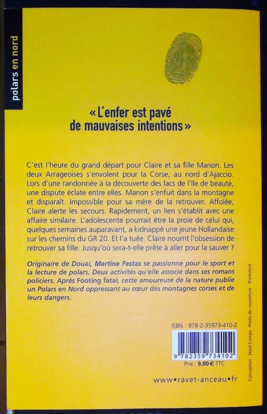 Auteur : Martine Festas, originaire de Douai, se passionne pour le sport et la lecture de polars. Deux activités qu’elle associe dans ses romans policiers. Après “Footing fatal”, cette amoureuse de la nature publie un “Polars en Nord” oppressant au cœur des montagnes corses et de leurs dangers.