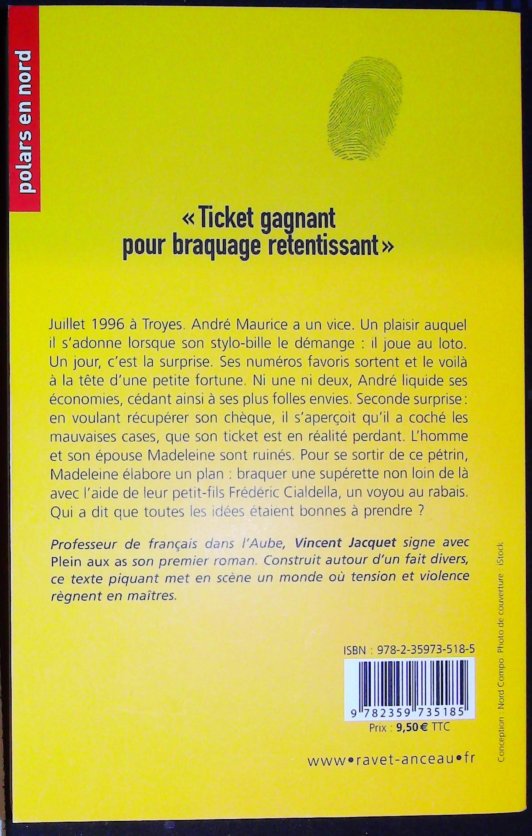 Auteur : Vincent Jacquet, professeur de français dans l’Aube, signe avec “Ticket gagnant pour braquage retentissant” son premier roman. Construit autour d’un fait divers, ce texte piquant met en scène un monde où tension et violence règnent en maîtres.