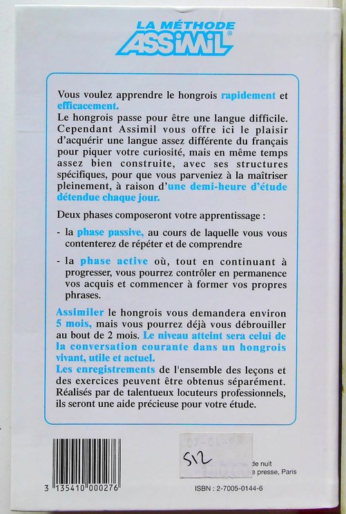 La couverture arrière présente La Méthode Assimil comme un outil pour apprendre le hongrois rapidement et efficacement, en surmontant la difficulté perçue de cette langue. L’ouvrage vise à susciter la curiosité du lecteur tout en lui offrant des structures bien construites, permettant de parvenir à une « demi-heure d’étude détendue chaque jour ». Le ton est rassurant et motivant : l’apprentissage n’est pas une contrainte, mais une expérience plaisir, adaptée au rythme de chacun.