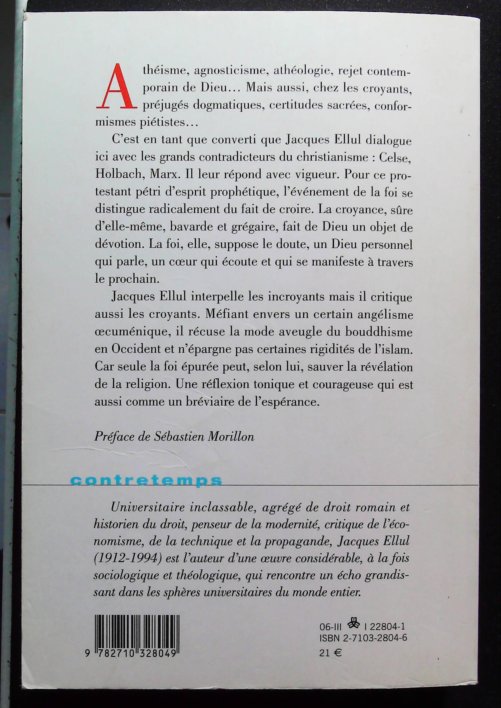 Ellul interpelle les incroyants tout en critiquant les croyants et les rigidités religieuses. Il dénonce la croyance grégaire qui fait de Dieu un objet de dévotion. EtIl oppose cette dernière à la foi, qui suppose le doute et se manifeste à travers le prochain. Il critique aussi l’angélisme œcuménique et le bouddhisme en Occident. Ce livre est pertinent pour l’étude de l’athéisme contemporain et la théologie protestante radicale.
