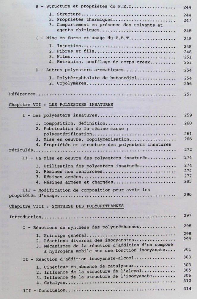 Ce chapitre s’ouvre sur les généralités des polyesters. Il décrit les réactions de polyestérification. Il distingue les polyesters aliphatiques saturés. L’étude des résines alkydes est incluse. Il aborde ensuite les polyesters aromatiques et leurs applications.