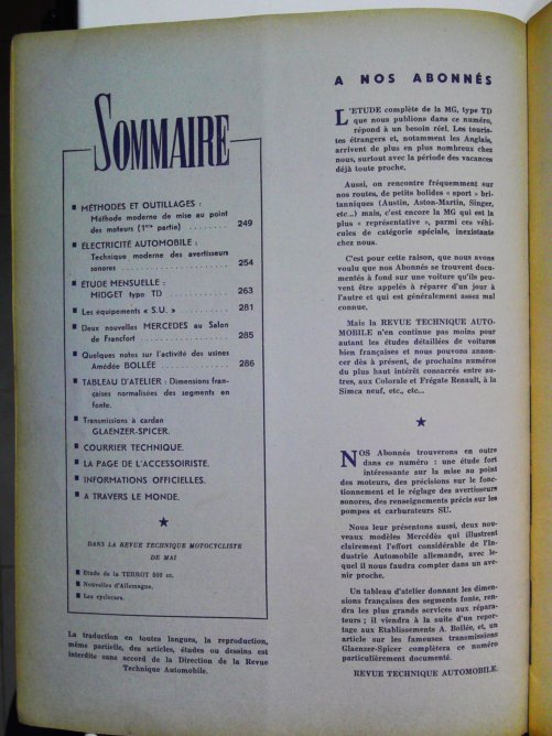 Dans la REVUE TECHNIQUE AUTOMOBILE, vous trouverez aussi des études détaillées de véhicules, des essais, des procédés de fabrication, des études de moteurs, des précisions sur le réglage des allumeurs, des carburations, etc.