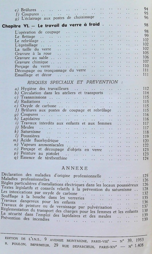 Ce recueil de l’Institut national de sécurité (INS), publié en 1953, est un document sectoriel fondamental sur l’hygiène et la sécurité dans l’art et l’industrie de la verrerie à la main, détaillant les risques professionnels et les méthodes de prévention spécifiques à ce métier traditionnel.