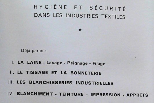 Ce manuel est un guide pratique des mesures de prévention des accidents du travail et des maladies professionnelles dans le secteur textile de l’époque. Il décrit les dispositifs de protection collective (ventilation, aspiration des poussières) et individuelle, les impératifs d’aération et de propreté des locaux, ainsi que les recommandations pour l’encoffrement des machines pour réduire le risque mécanique et le bruit. Il est essentiel pour comprendre l’évolution de la réglementation sécurité post-guerre.
