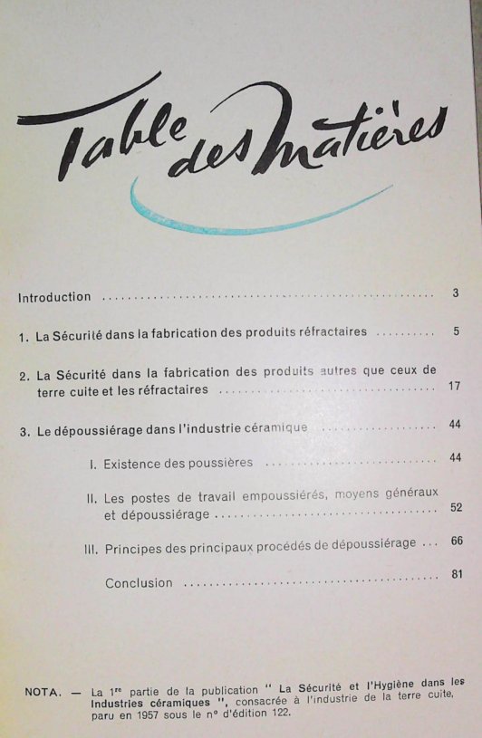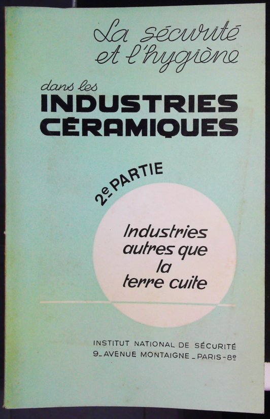 NOTA — La 1ʳᵉ partie de la publication “La Sécurité et l’Hygiène dans les Industries céramiques”, consacrée à l’industrie de la terre cuite, est parue en 1957 sous le n° d’édition 122.