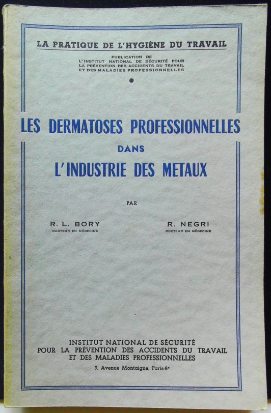 Publié en 1960 par l’Institut national de sécurité (INS), cet ouvrage est une étude de référence sur les dermatoses professionnelles spécifiquement dans l’industrie des métaux. Il offre une analyse détaillée des causes et manifestations des maladies de la peau chez les ouvriers. Cet écrit est une source primordiale pour les professionnels en hygiène industrielle et en médecine du travail s’intéressant aux risques cutanés historiques.