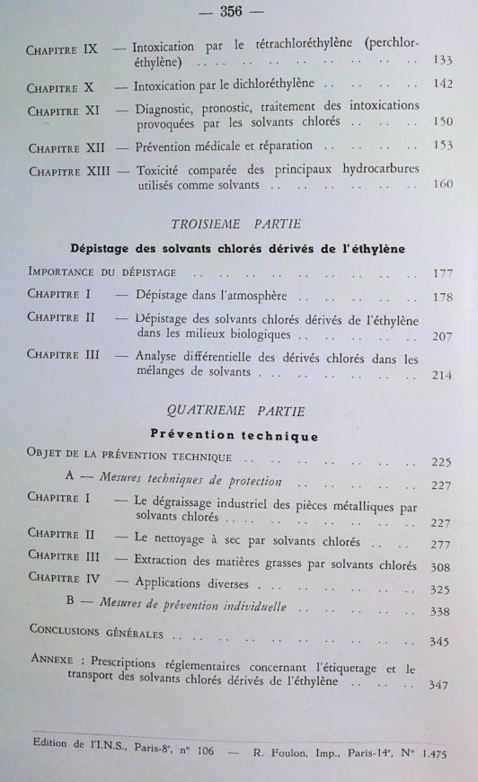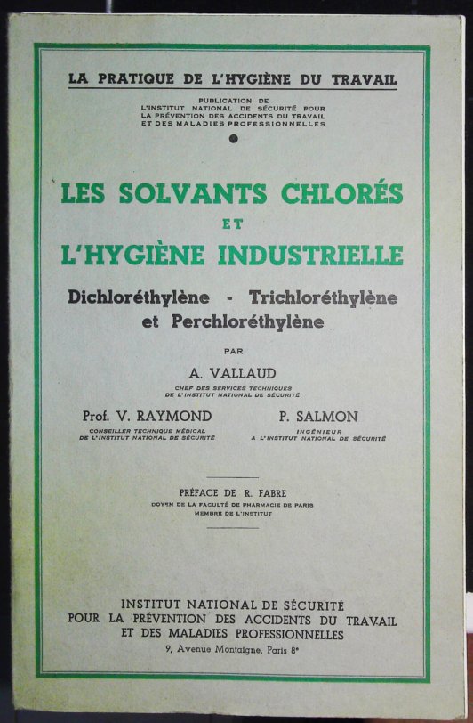 Cet ouvrage fondamental de l’Institut national de sécurité (INS) des années 1960 est une référence historique dans le domaine de l’hygiène industrielle. Il détaille la toxicité et les risques spécifiques liés à l’utilisation des principaux solvants chlorés de l’époque, notamment le dichloréthylène, le trichloréthylène (TCE) et le perchloréthylène (PCE). L’analyse porte sur les mécanismes d’intoxication, les effets sur la santé humaine, et les dangers potentiels en milieu de travail.