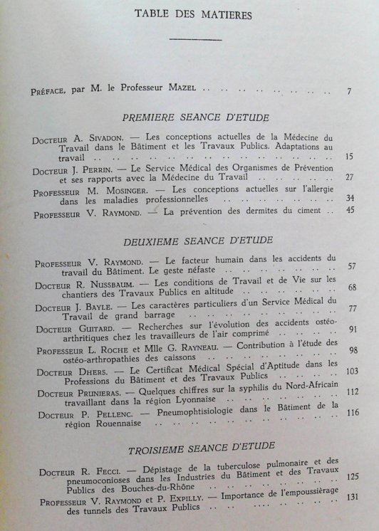Docteur A. Sivadon – Les conceptions actuelles de la Médecine du Travail dans le Bâtiment et les Travaux Publics. Adaptations au travail …………………….. 15