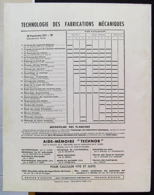 Chaque aria de l’encyclopédie de la Collection CHEVALIER, “Technologie des Fabrications Mécaniques”, introduite à l’utilité des enseignants et des industriels, est disponible sous forme de microfilms de 228 images, utilisables sur tous les appareils de lecture.